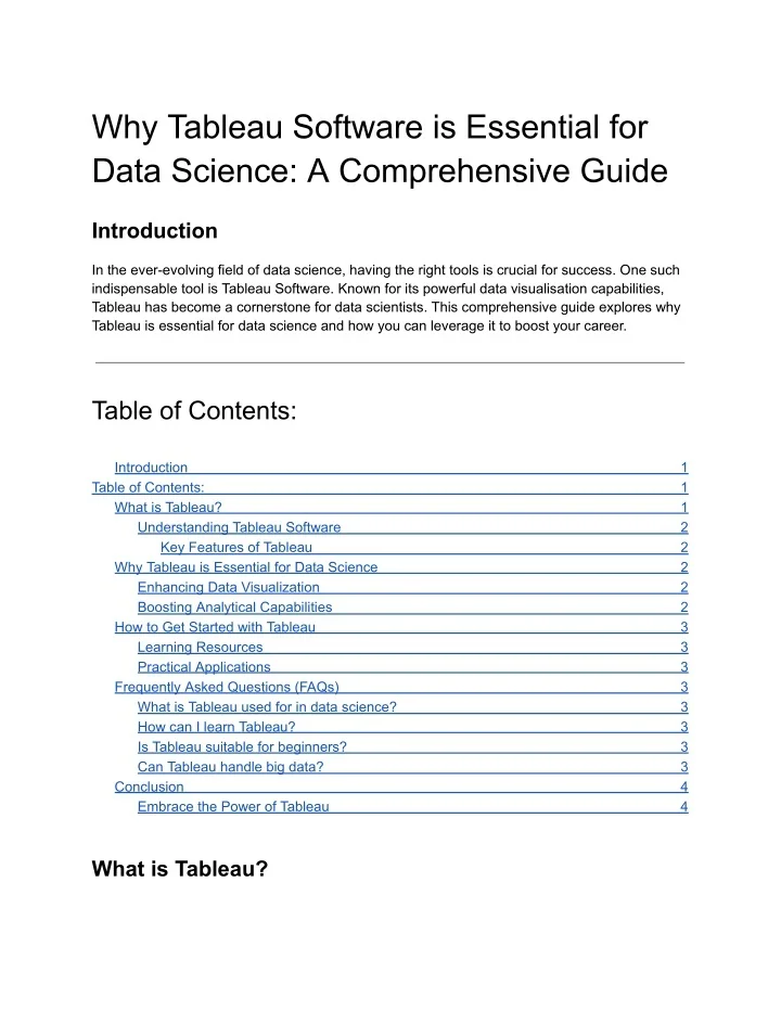 Why Tableau Software is Essential for Data Science: A Comprehensive Guide Introduction In the ever-evolving field of data science, having the right tools is crucial for success. One such indispensable tool is Tableau Software. Known for its powerful data visualisation capabilities, Tableau has become a cornerstone for data scientists. This comprehensive guide explores why Tableau is essential for data science and how you can leverage it to boost your career. Table of Contents: Introduction Table of Contents: What is Tableau? Understanding Tableau Software Key Features of Tableau Why Tableau is Essential for Data Science Enhancing Data Visualization Boosting Analytical Capabilities How to Get Started with Tableau Learning Resources Practical Applications Frequently Asked Questions (FAQs) What is Tableau used for in data science? How can I learn Tableau? Is Tableau suitable for beginners? Can Tableau handle big data? Conclusion Embrace the Power of Tableau 1 1 1 2 2 2 2 2 3 3 3 3 3 3 3 3 4 4 What is Tableau?