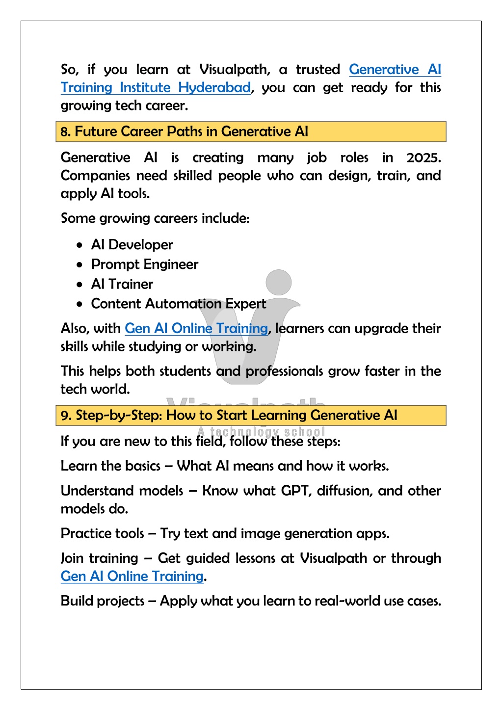 4. So, if you learn at Visualpath, a trusted Generative AI Training Institute Hyderabad, you can get ready for this growing tech career. 8. Future Career Paths in Generative AI Generative AI is creating many job roles in 2025. Companies need skilled people who can design, train, and apply AI tools. Some growing careers include: AI Developer Prompt Engineer AI Trainer Content Automation Expert Also, with Gen AI Online Training, learners can upgrade their skills while studying or working. This helps both students and professionals grow faster in the tech world. 9. Step-by-Step: How to Start Learning Generative AI If you are new to this field, follow these steps: Learn the basics – What AI means and how it works. Understand models – Know what GPT, diffusion, and other models do. Practice tools – Try text and image generation apps. Join training – Get guided lessons at Visualpath or through Gen AI Online Training. Build projects – Apply what you learn to real-world use cases.