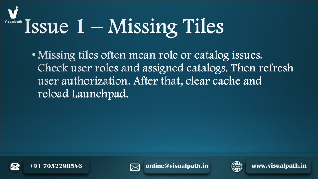 4. Issue 1 – Missing Tiles • Missing tiles often mean role or catalog issues. Check user roles and assigned catalogs. Then refresh user authorization. After that, clear cache and reload Launchpad.