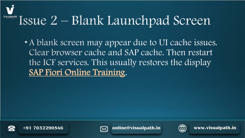 5. Issue 2 – Blank Launchpad Screen • A blank screen may appear due to UI cache issues. Clear browser cache and SAP cache. Then restart the ICF services. This usually restores the displaySAP Fiori Online Training.
