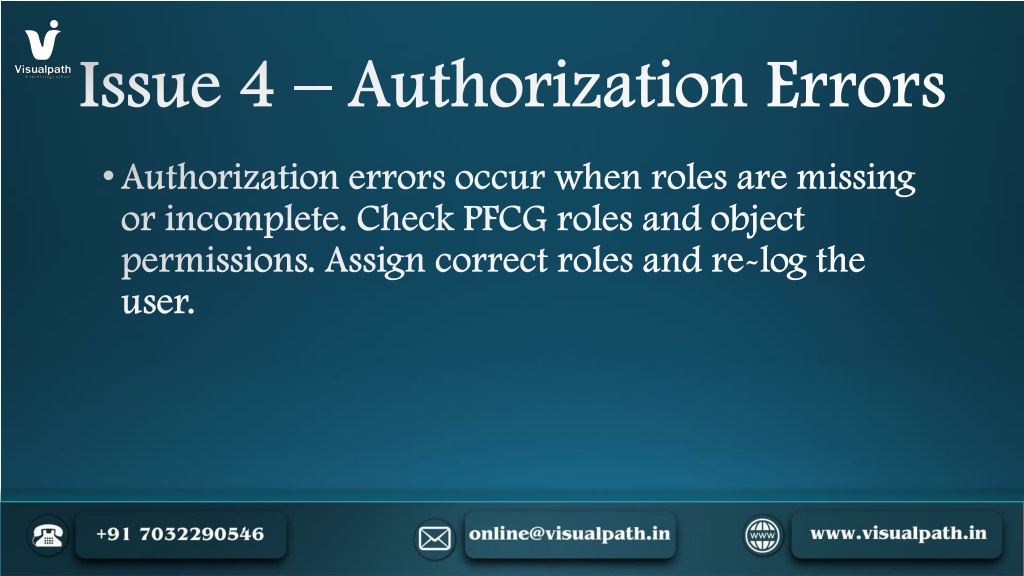 7. Issue 4 – Authorization Errors • Authorization errors occur when roles are missing or incomplete. Check PFCG roles and object permissions. Assign correct roles and re-log the user.