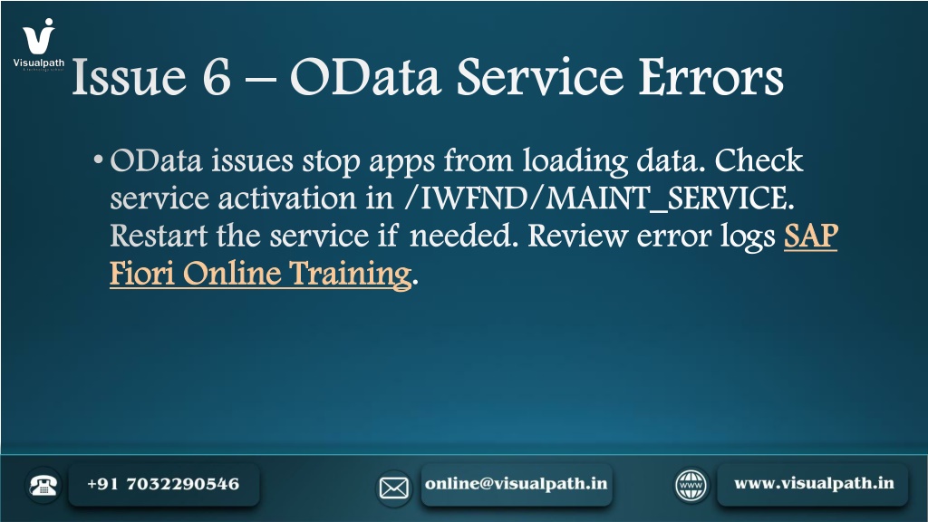 9. Issue 6 – OData Service Errors • OData issues stop apps from loading data. Check service activation in /IWFND/MAINT_SERVICE. Restart the service if needed. Review error logsSAP Fiori Online Training.