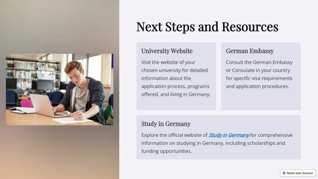 Next Steps and Resources Next Steps and Resources University Website University Website German Embassy German Embassy Visit the website of your chosen university for detailed information about the application process, programs offered, and living in Germany. Consult the German Embassy or Consulate in your country for specific visa requirements and application procedures. Study in Germany Study in Germany Explore the official website of Study in Germany information on studying in Germany, including scholarships and funding opportunities. Study in Germany for comprehensive