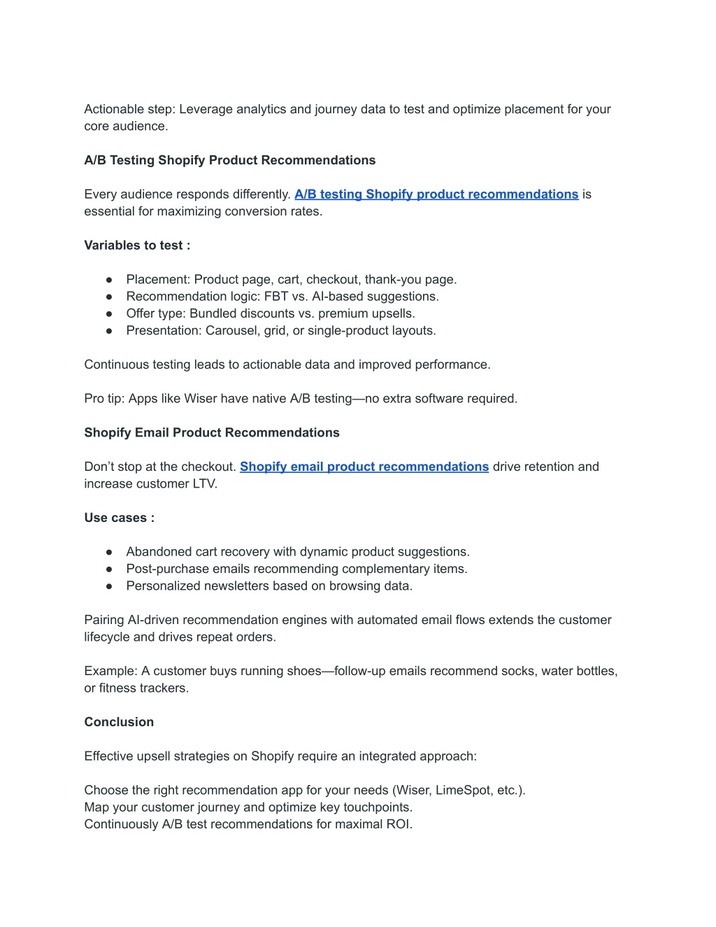 Actionable step: Leverage analytics and journey data to test and optimize placement for your core audience. A/B Testing Shopify Product Recommendations Every audience responds differently. A/B testing Shopify product recommendations is essential for maximizing conversion rates. Variables to test : ● Placement: Product page, cart, checkout, thank-you page. ● Recommendation logic: FBT vs. AI-based suggestions. ● Offer type: Bundled discounts vs. premium upsells. ● Presentation: Carousel, grid, or single-product layouts. Continuous testing leads to actionable data and improved performance. Pro tip: Apps like Wiser have native A/B testing—no extra software required. Shopify Email Product Recommendations Don’t stop at the checkout. Shopify email product recommendations drive retention and increase customer LTV. Use cases : ● Abandoned cart recovery with dynamic product suggestions. ● Post-purchase emails recommending complementary items. ● Personalized newsletters based on browsing data. Pairing AI-driven recommendation engines with automated email flows extends the customer lifecycle and drives repeat orders. Example: A customer buys running shoes—follow-up emails recommend socks, water bottles, or fitness trackers. Conclusion Effective upsell strategies on Shopify require an integrated approach: Choose the right recommendation app for your needs (Wiser, LimeSpot, etc.). Map your customer journey and optimize key touchpoints. Continuously A/B test recommendations for maximal ROI.