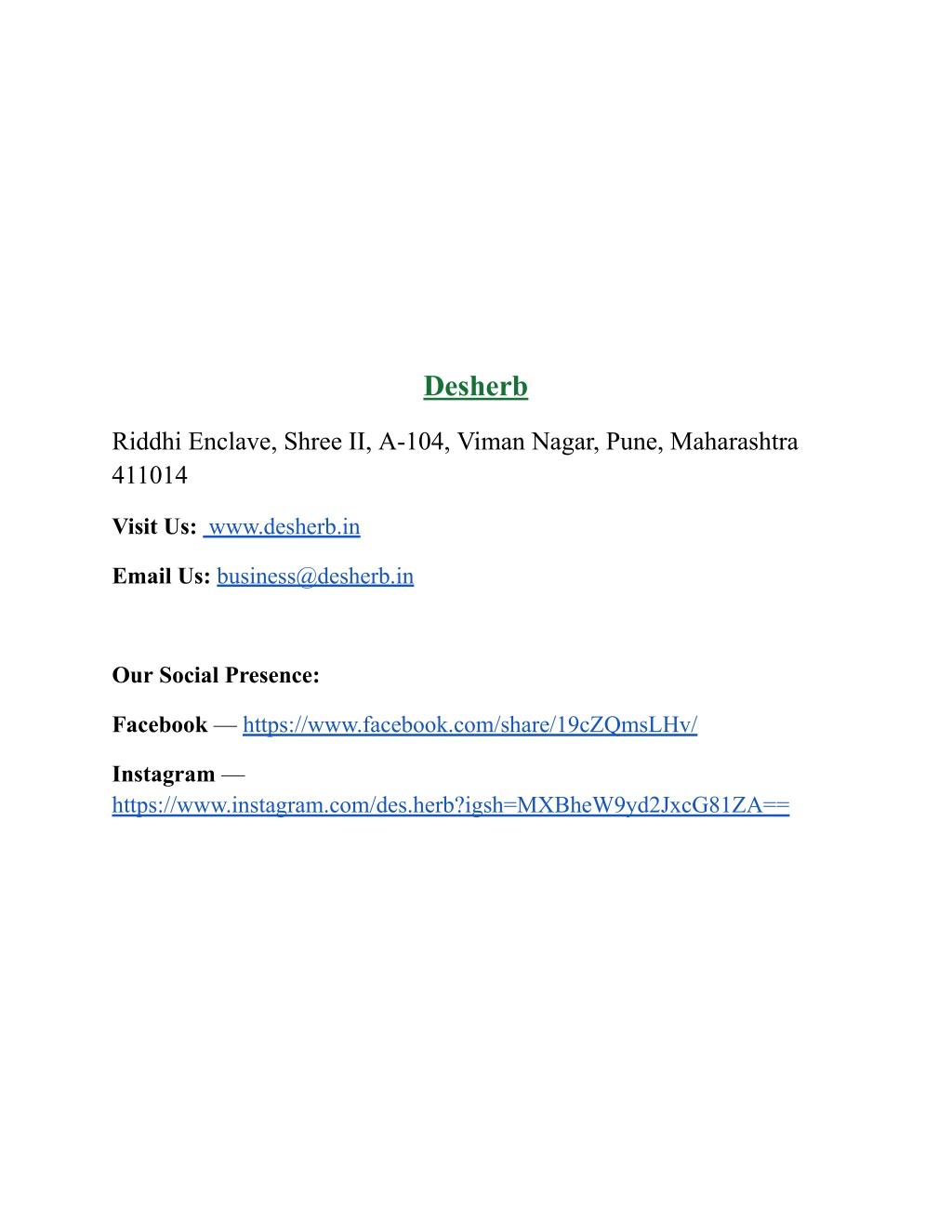 Desherb Riddhi Enclave, Shree II, A-104, Viman Nagar, Pune, Maharashtra 411014 Visit Us: www.desherb.in Email Us: business@desherb.in Our Social Presence: Facebook — https://www.facebook.com/share/19cZQmsLHv/ Instagram — https://www.instagram.com/des.herb?igsh=MXBheW9yd2JxcG81ZA==