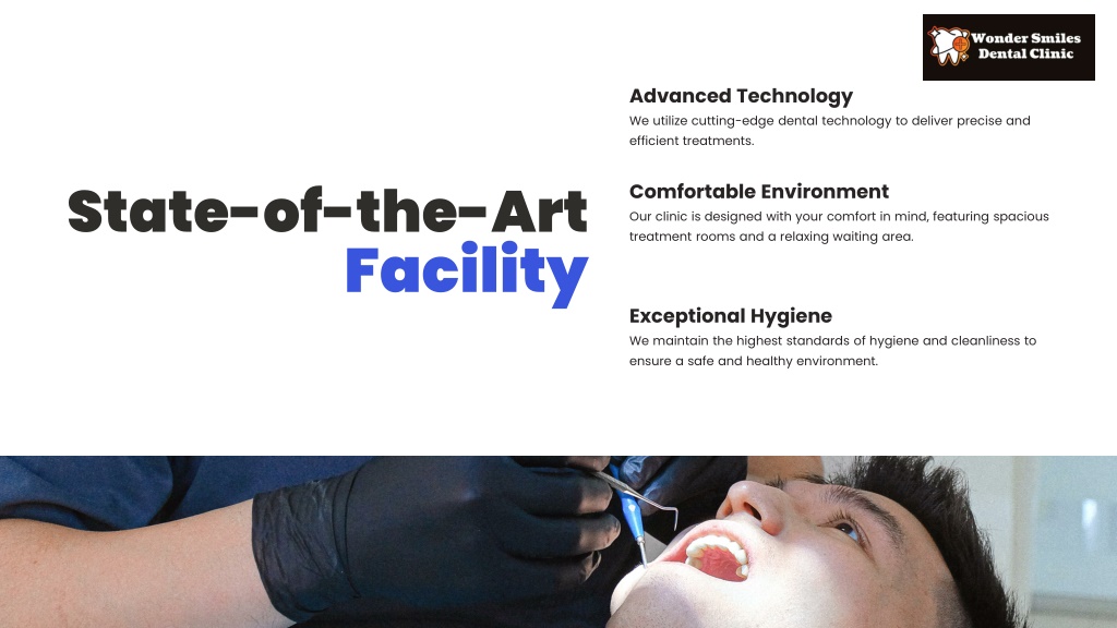 Advanced Technology We utilize cutting-edge dental technology to deliver precise and efficient treatments. Comfortable Environment State-of-the-Art Our clinic is designed with your comfort in mind, featuring spacious treatment rooms and a relaxing waiting area. Facility Exceptional Hygiene We maintain the highest standards of hygiene and cleanliness to ensure a safe and healthy environment.
