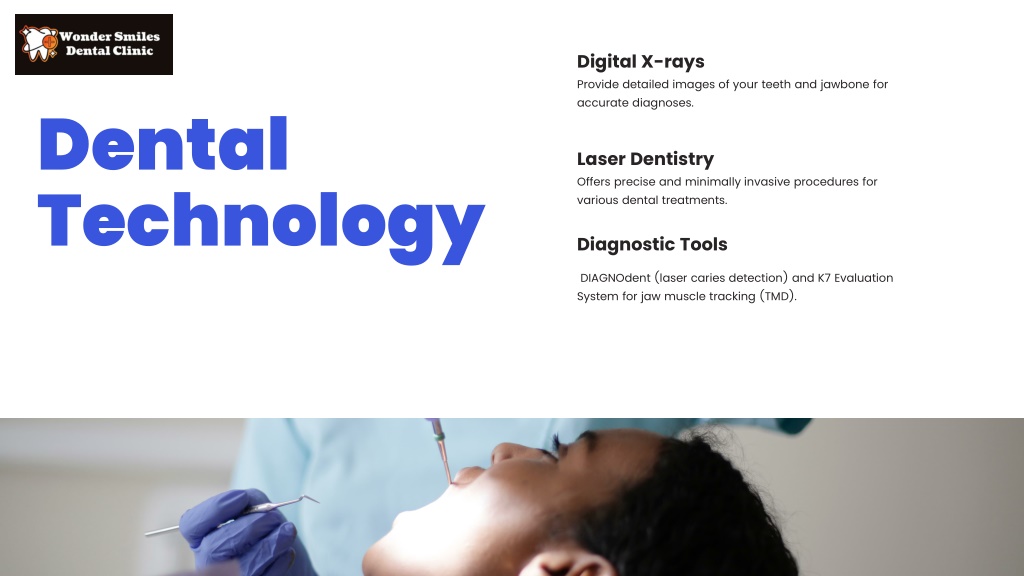 Digital X-rays Provide detailed images of your teeth and jawbone for accurate diagnoses. Dental Technology Laser Dentistry Offers precise and minimally invasive procedures for various dental treatments. Diagnostic Tools DIAGNOdent (laser caries detection) and K7 Evaluation System for jaw muscle tracking (TMD).