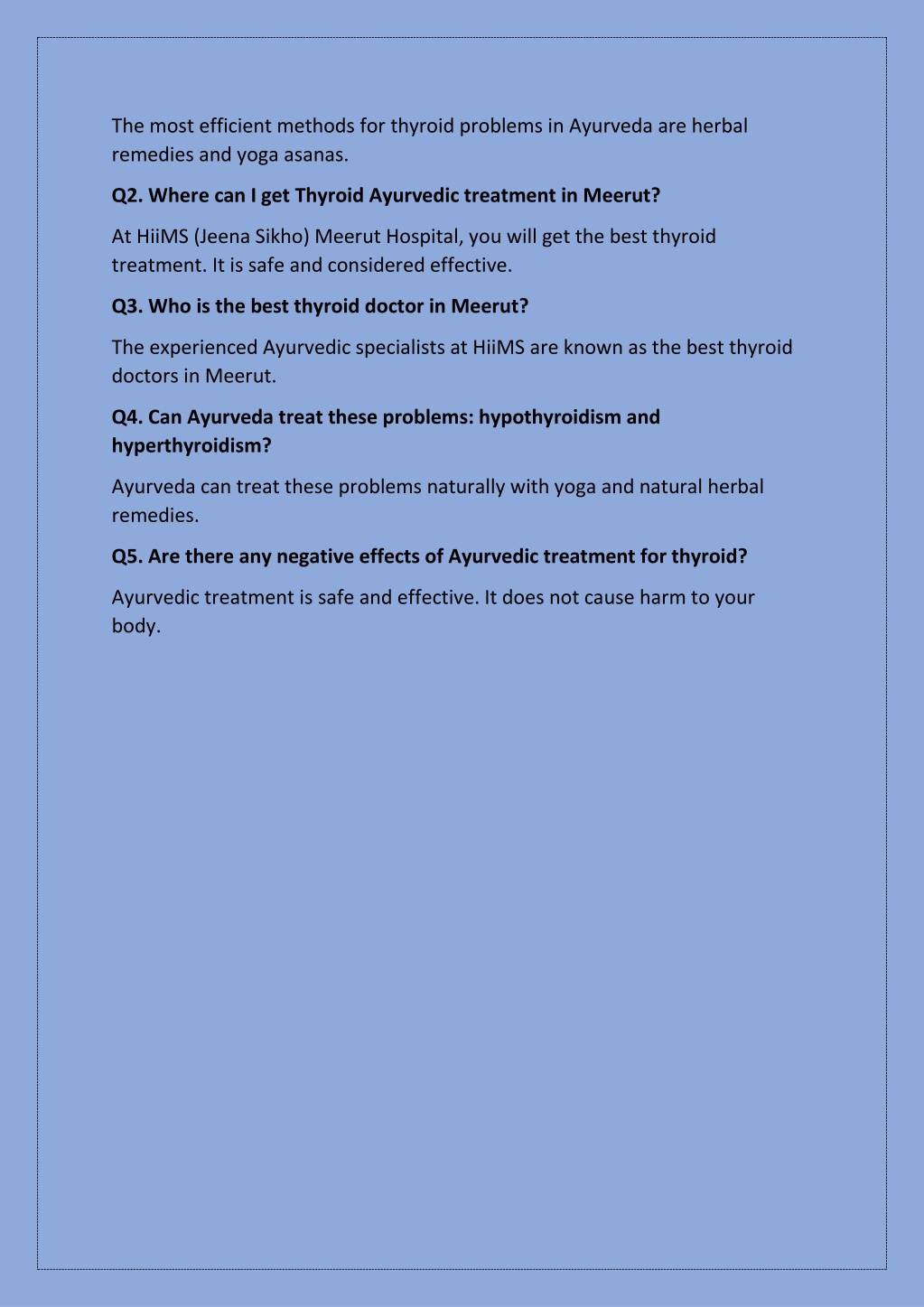 The most efficient methods for thyroid problems in Ayurveda are herbal remedies and yoga asanas. Q2. Where can I get Thyroid Ayurvedic treatment in Meerut? At HiiMS (Jeena Sikho) Meerut Hospital, you will get the best thyroid treatment. It is safe and considered effective. Q3. Who is the best thyroid doctor in Meerut? The experienced Ayurvedic specialists at HiiMS are known as the best thyroid doctors in Meerut. Q4. Can Ayurveda treat these problems: hypothyroidism and hyperthyroidism? Ayurveda can treat these problems naturally with yoga and natural herbal remedies. Q5. Are there any negative effects of Ayurvedic treatment for thyroid? Ayurvedic treatment is safe and effective. It does not cause harm to your body.
