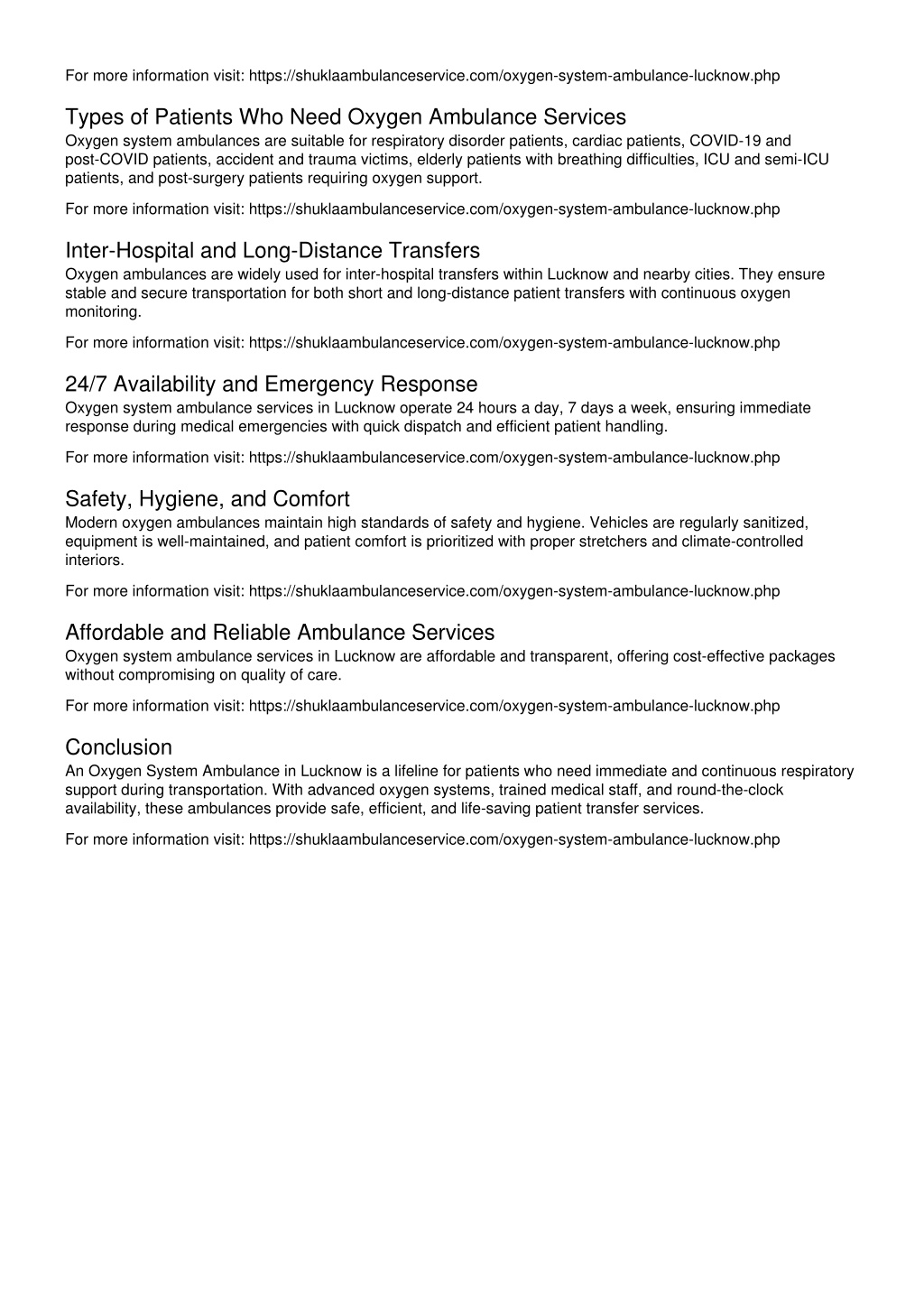 For more information visit: https://shuklaambulanceservice.com/oxygen-system-ambulance-lucknow.php Types of Patients Who Need Oxygen Ambulance Services Oxygen system ambulances are suitable for respiratory disorder patients, cardiac patients, COVID-19 and post-COVID patients, accident and trauma victims, elderly patients with breathing difficulties, ICU and semi-ICU patients, and post-surgery patients requiring oxygen support. For more information visit: https://shuklaambulanceservice.com/oxygen-system-ambulance-lucknow.php Inter-Hospital and Long-Distance Transfers Oxygen ambulances are widely used for inter-hospital transfers within Lucknow and nearby cities. They ensure stable and secure transportation for both short and long-distance patient transfers with continuous oxygen monitoring. For more information visit: https://shuklaambulanceservice.com/oxygen-system-ambulance-lucknow.php 24/7 Availability and Emergency Response Oxygen system ambulance services in Lucknow operate 24 hours a day, 7 days a week, ensuring immediate response during medical emergencies with quick dispatch and efficient patient handling. For more information visit: https://shuklaambulanceservice.com/oxygen-system-ambulance-lucknow.php Safety, Hygiene, and Comfort Modern oxygen ambulances maintain high standards of safety and hygiene. Vehicles are regularly sanitized, equipment is well-maintained, and patient comfort is prioritized with proper stretchers and climate-controlled interiors. For more information visit: https://shuklaambulanceservice.com/oxygen-system-ambulance-lucknow.php Affordable and Reliable Ambulance Services Oxygen system ambulance services in Lucknow are affordable and transparent, offering cost-effective packages without compromising on quality of care. For more information visit: https://shuklaambulanceservice.com/oxygen-system-ambulance-lucknow.php Conclusion An Oxygen System Ambulance in Lucknow is a lifeline for patients who need immediate and continuous respiratory support during transportation. With advanced oxygen systems, trained medical staff, and round-the-clock availability, these ambulances provide safe, efficient, and life-saving patient transfer services. For more information visit: https://shuklaambulanceservice.com/oxygen-system-ambulance-lucknow.php