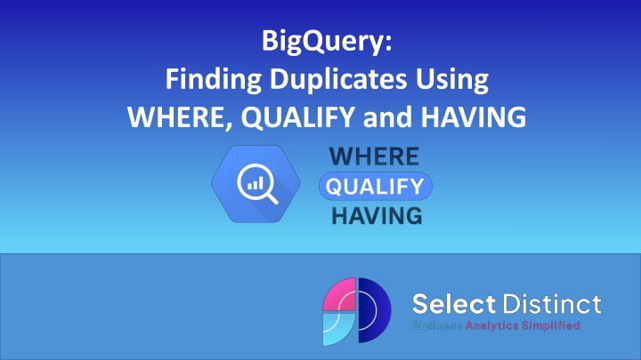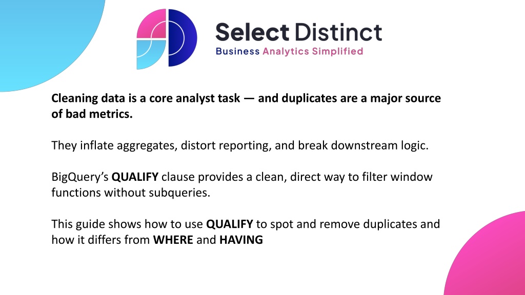 Weu2019ve all dealt with duplicate records that distort metrics and complicate downstream SQL logic. This presentation walks through how to identify and remove duplicates in BigQuery using WHERE, HAVING, and the QUALIFY clause u2014 a clean, modern way to filter window functions without subqueries.<br><br>The slides cover:<br>u2022 tWHERE vs HAVING vs QUALIFY<br>u2022 tHow QUALIFY fits into the SQL processing order<br>u2022 tUsing to detect duplicates<br>u2022 tKeeping only the latest record per key<br>u2022 tSimple SQL patterns you can reuse in any BigQuery model<br><br>Based on my full blog post:<br>https://www.selectdistinct.co.uk/2026/02/12/fin<br>