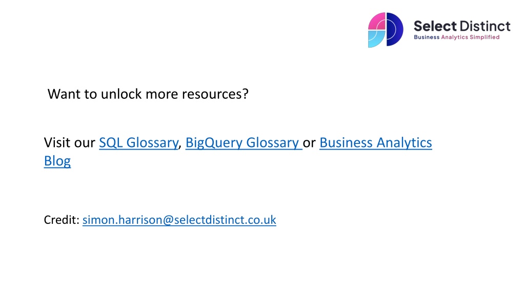 Credit: simon.harrison@selectdistinct.co.uk Want to unlock more resources? Visit our SQL Glossary, BigQuery Glossary or Business Analytics Blog