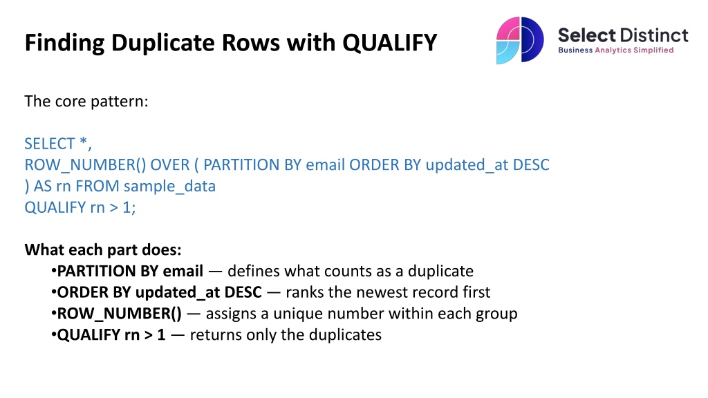 Finding Duplicate Rows with QUALIFY • The core pattern: • SELECT *, • ROW_NUMBER() OVER ( PARTITION BY email ORDER BY updated_at DESC • ) AS rn FROM sample_data • QUALIFY rn > 1; What each part does: • PARTITION BY email — defines what counts as a duplicate • ORDER BY updated_at DESC — ranks the newest record first • ROW_NUMBER() — assigns a unique number within each group • QUALIFY rn > 1 — returns only the duplicates