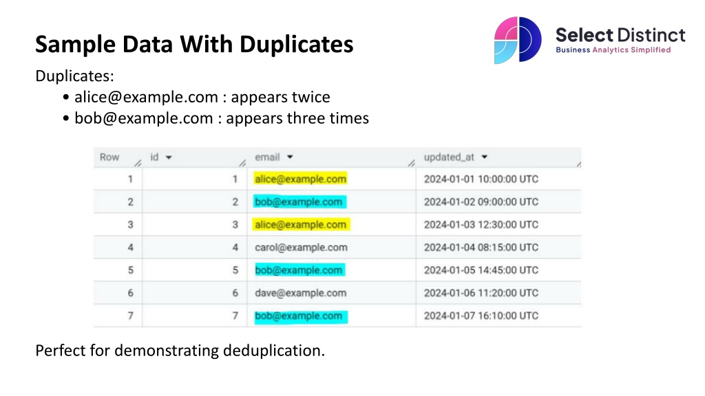 Sample Data With Duplicates • Duplicates: • • alice@example.com : appears twice • • bob@example.com : appears three times • Perfect for demonstrating deduplication.