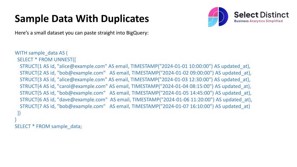 Sample Data With Duplicates Here’s a small dataset you can paste straight into BigQuery: WITH sample_data AS ( SELECT * FROM UNNEST([ STRUCT(1 AS id, "alice@example.com" AS email, TIMESTAMP("2024-01-01 10:00:00") AS updated_at), STRUCT(2 AS id, "bob@example.com" AS email, TIMESTAMP("2024-01-02 09:00:00") AS updated_at), STRUCT(3 AS id, "alice@example.com" AS email, TIMESTAMP("2024-01-03 12:30:00") AS updated_at), STRUCT(4 AS id, "carol@example.com" AS email, TIMESTAMP("2024-01-04 08:15:00") AS updated_at), STRUCT(5 AS id, "bob@example.com" AS email, TIMESTAMP("2024-01-05 14:45:00") AS updated_at), STRUCT(6 AS id, "dave@example.com" AS email, TIMESTAMP("2024-01-06 11:20:00") AS updated_at), STRUCT(7 AS id, "bob@example.com" AS email, TIMESTAMP("2024-01-07 16:10:00") AS updated_at) ]) ) SELECT * FROM sample_data;