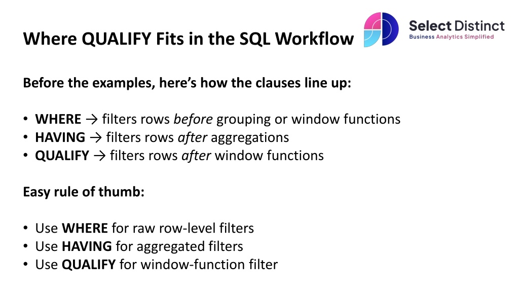 Where QUALIFY Fits in the SQL Workflow • Before the examples, here’s how the clauses line up: • WHERE → filters rows before grouping or window functions • HAVING → filters rows after aggregations • QUALIFY → filters rows after window functions • Easy rule of thumb: • Use WHERE for raw row‑level filters • Use HAVING for aggregated filters • Use QUALIFY for window‑function filter