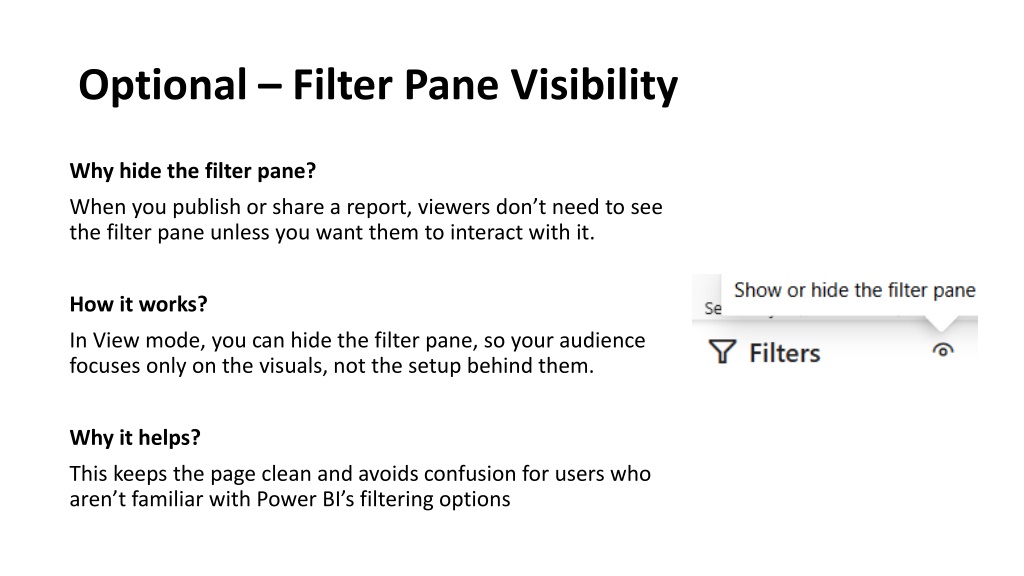 Optional – Filter Pane Visibility Why hide the filter pane? When you publish or share a report, viewers don’t need to see the filter pane unless you want them to interact with it. How it works? In View mode, you can hide the filter pane, so your audience focuses only on the visuals, not the setup behind them. Why it helps? This keeps the page clean and avoids confusion for users who aren’t familiar with Power BI’s filtering options