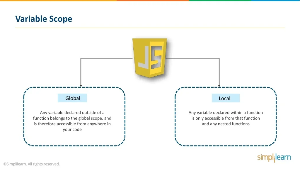 Variable Scope Global Local Any variable declared within a function is only accessible from that function and any nested functions Any variable declared outside of a function belongs to the global scope, and is therefore accessible from anywhere in your code