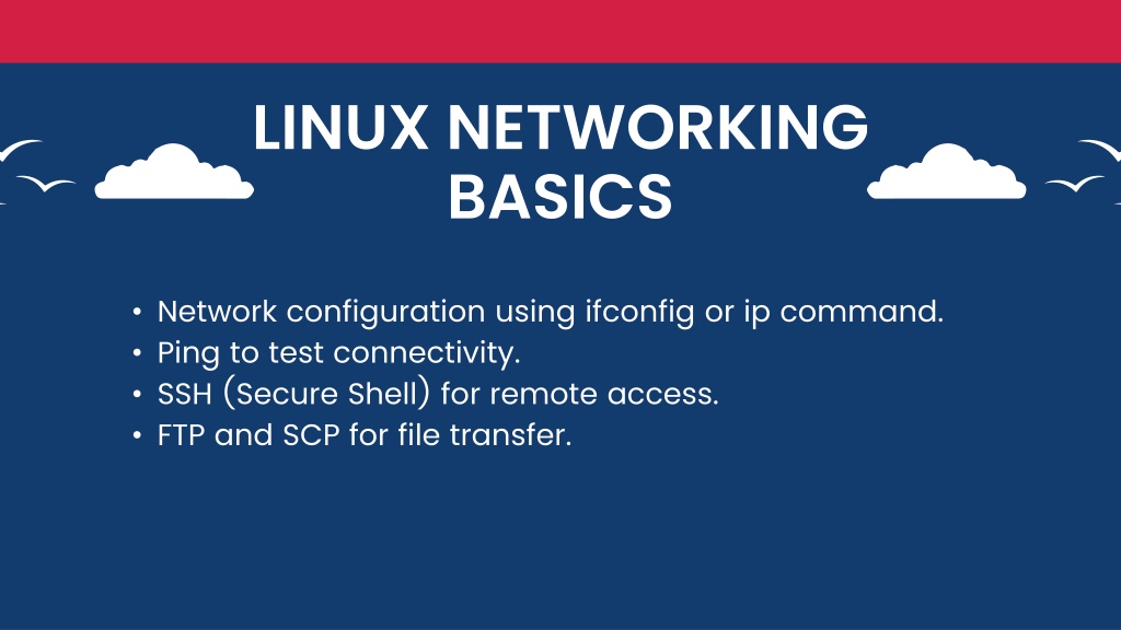 LINUX NETWORKING BASICS • Network configuration using ifconfig or ip command. • Ping to test connectivity. • SSH (Secure Shell) for remote access. • FTP and SCP for file transfer.