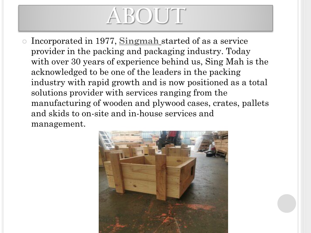 ABOUT • Incorporated in 1977, Singmahstarted of as a service provider in the packing and packaging industry. Today with over 30 years of experience behind us, Sing Mah is the acknowledged to be one of the leaders in the packing industry with rapid growth and is now positioned as a total solutions provider with services ranging from the manufacturing of wooden and plywood cases, crates, pallets and skids to on-site and in-house services and management.