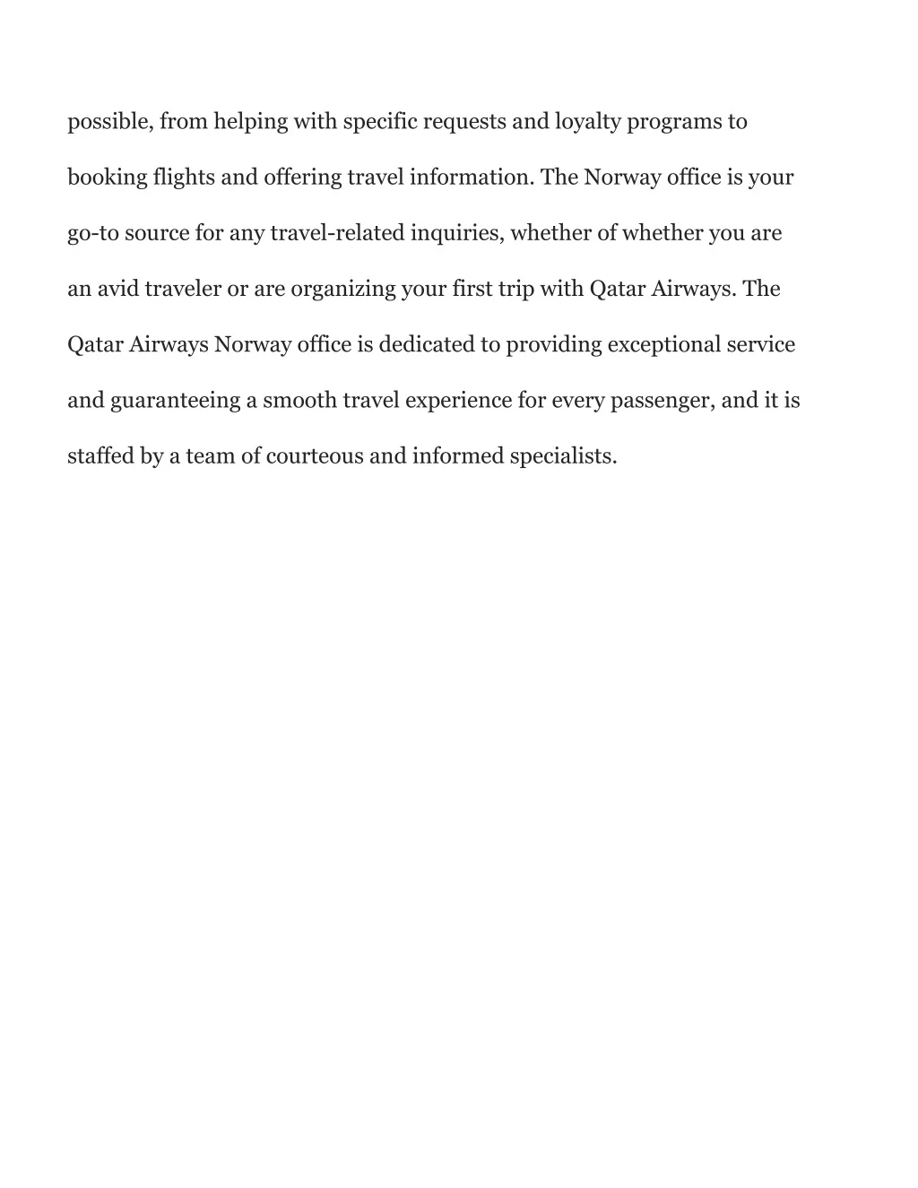possible, from helping with specific requests and loyalty programs to booking flights and offering travel information. The Norway office is your go-to source for any travel-related inquiries, whether of whether you are an avid traveler or are organizing your first trip with Qatar Airways. The Qatar Airways Norway office is dedicated to providing exceptional service and guaranteeing a smooth travel experience for every passenger, and it is staffed by a team of courteous and informed specialists.
