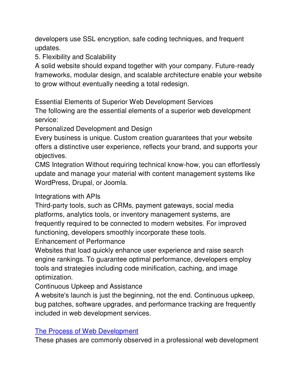 developers use SSL encryption, safe coding techniques, and frequent updates. 5. Flexibility and Scalability A solid website should expand together with your company. Future-ready frameworks, modular design, and scalable architecture enable your website to grow without eventually needing a total redesign. Essential Elements of Superior Web Development Services The following are the essential elements of a superior web development service: Personalized Development and Design Every business is unique. Custom creation guarantees that your website offers a distinctive user experience, reflects your brand, and supports your objectives. CMS Integration Without requiring technical know-how, you can effortlessly update and manage your material with content management systems like WordPress, Drupal, or Joomla. Integrations with APIs Third-party tools, such as CRMs, payment gateways, social media platforms, analytics tools, or inventory management systems, are frequently required to be connected to modern websites. For improved functioning, developers smoothly incorporate these tools. Enhancement of Performance Websites that load quickly enhance user experience and raise search engine rankings. To guarantee optimal performance, developers employ tools and strategies including code minification, caching, and image optimization. Continuous Upkeep and Assistance A website's launch is just the beginning, not the end. Continuous upkeep, bug patches, software upgrades, and performance tracking are frequently included in web development services. The Process of Web Development These phases are commonly observed in a professional web development