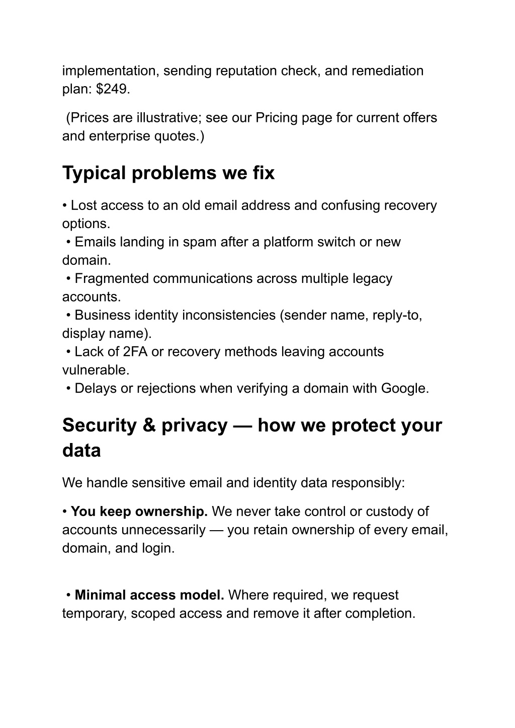 7. implementation, sending reputation check, and remediation plan: $249. (Prices are illustrative; see our Pricing page for current offers and enterprise quotes.) Typical problems we fix • Lost access to an old email address and confusing recovery options. • Emails landing in spam after a platform switch or new domain. • Fragmented communications across multiple legacy accounts. • Business identity inconsistencies (sender name, reply-to, display name). • Lack of 2FA or recovery methods leaving accounts vulnerable. • Delays or rejections when verifying a domain with Google. Security & privacy — how we protect your data We handle sensitive email and identity data responsibly: • You keep ownership. We never take control or custody of accounts unnecessarily — you retain ownership of every email, domain, and login. • Minimal access model. Where required, we request temporary, scoped access and remove it after completion.