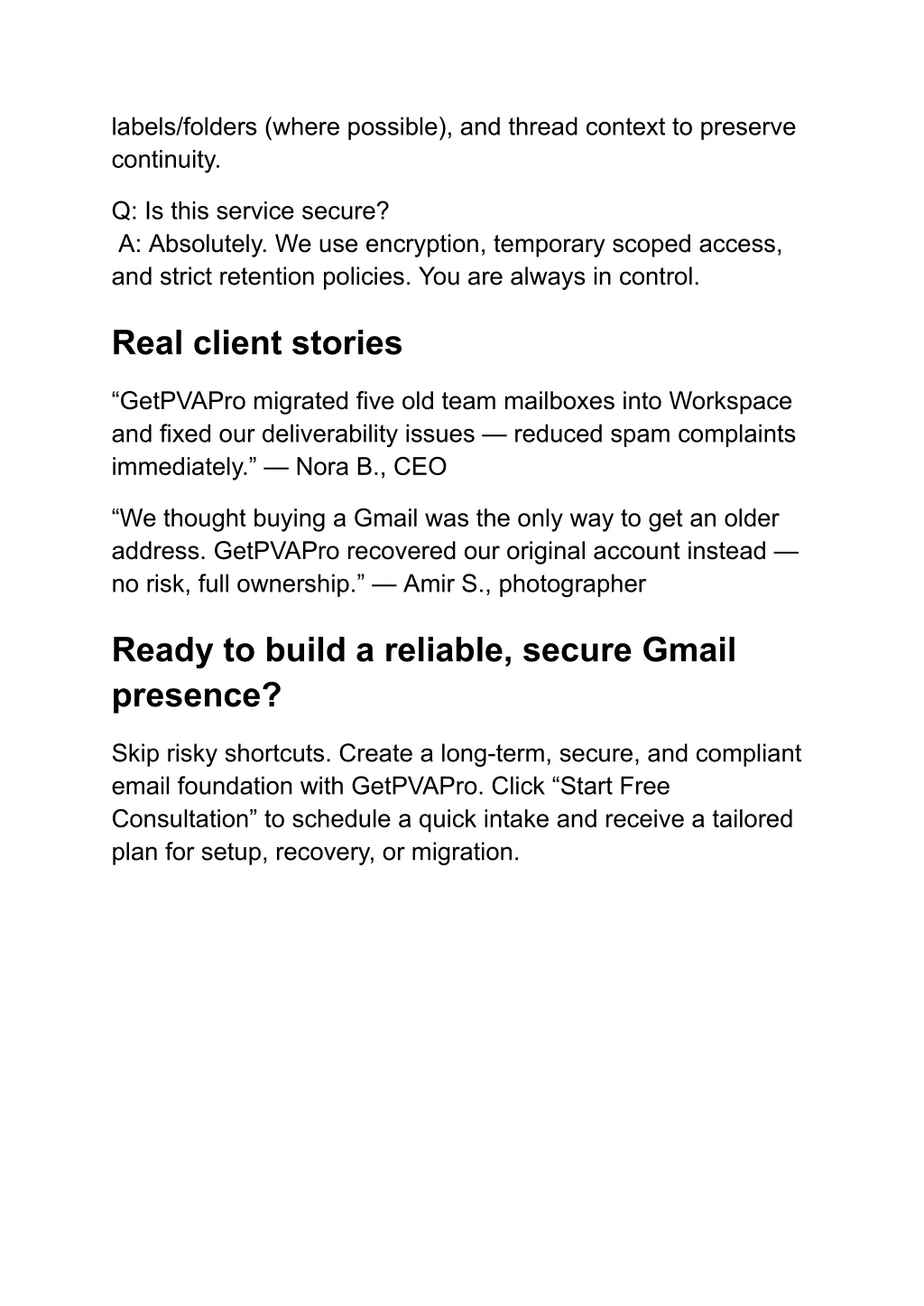 9. labels/folders (where possible), and thread context to preserve continuity. Q: Is this service secure? A: Absolutely. We use encryption, temporary scoped access, and strict retention policies. You are always in control. Real client stories “GetPVAPro migrated five old team mailboxes into Workspace and fixed our deliverability issues — reduced spam complaints immediately.” — Nora B., CEO “We thought buying a Gmail was the only way to get an older address. GetPVAPro recovered our original account instead — no risk, full ownership.” — Amir S., photographer Ready to build a reliable, secure Gmail presence? Skip risky shortcuts. Create a long-term, secure, and compliant email foundation with GetPVAPro. Click “Start Free Consultation” to schedule a quick intake and receive a tailored plan for setup, recovery, or migration.