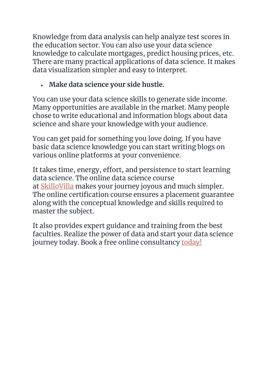 Knowledge from data analysis can help analyze test scores in the education sector. You can also use your data science knowledge to calculate mortgages, predict housing prices, etc. There are many practical applications of data science. It makes data visualization simpler and easy to interpret. •Make data science your side hustle. You can use your data science skills to generate side income. Many opportunities are available in the market. Many people chose to write educational and information blogs about data science and share your knowledge with your audience. You can get paid for something you love doing. If you have basic data science knowledge you can start writing blogs on various online platforms at your convenience. It takes time, energy, effort, and persistence to start learning data science. The online data science course at SkilloVilla makes your journey joyous and much simpler. The online certification course ensures a placement guarantee along with the conceptual knowledge and skills required to master the subject. It also provides expert guidance and training from the best faculties. Realize the power of data and start your data science journey today. Book a free online consultancy today!