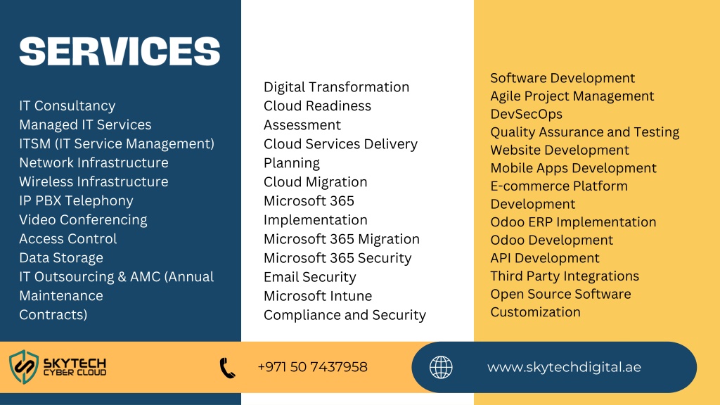 Software Development Agile Project Management DevSecOps Quality Assurance and Testing Website Development Mobile Apps Development E-commerce Platform Development Odoo ERP Implementation Odoo Development API Development Third Party Integrations Open Source Software Customization Digital Transformation Cloud Readiness Assessment Cloud Services Delivery Planning Cloud Migration Microsoft 365 Implementation Microsoft 365 Migration Microsoft 365 Security Email Security Microsoft Intune Compliance and Security IT Consultancy Managed IT Services ITSM (IT Service Management) Network Infrastructure Wireless Infrastructure IP PBX Telephony Video Conferencing Access Control Data Storage IT Outsourcing & AMC (Annual Maintenance Contracts) +971 50 7437958 www.skytechdigital.ae