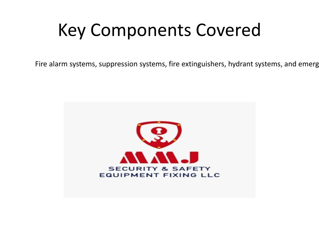 Key Components Covered Fire alarm systems, suppression systems, fire extinguishers, hydrant systems, and emergency response equipment.