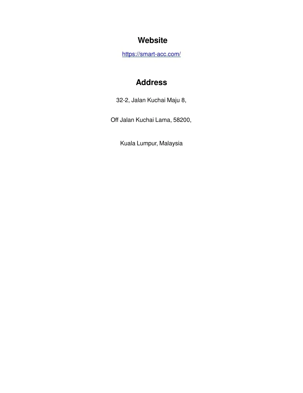 Website https://smart-acc.com/ Address 32-2, Jalan Kuchai Maju 8, OffJalanKuchaiLama,58200, KualaLumpur,Malaysia
