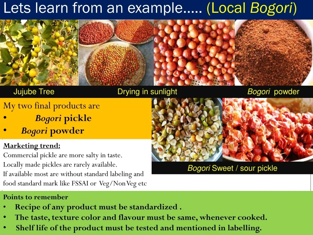 Lets learn from an example..... (LocalBogori) Jujube Tree Drying in sunlight Bogori powder • My two final products are • Bogori pickle • Bogori powder Marketing trend: Commercial pickle are more salty in taste. Locally made pickles are rarely available. If available most are without standard labeling and food standard mark like FSSAI or Veg/Non Veg etc Bogori Sweet / sour pickle • Points to remember • Recipe of any product must be standardized . • The taste, texture color and flavour must be same, whenever cooked. • Shelf life of the product must be tested and mentioned in labelling.