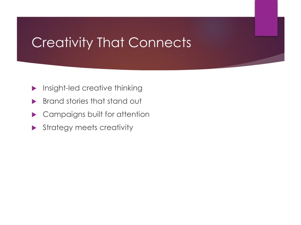 Creativity That Connects Insight-led creative thinking Brand stories that stand out Campaigns built for attention Strategy meets creativity