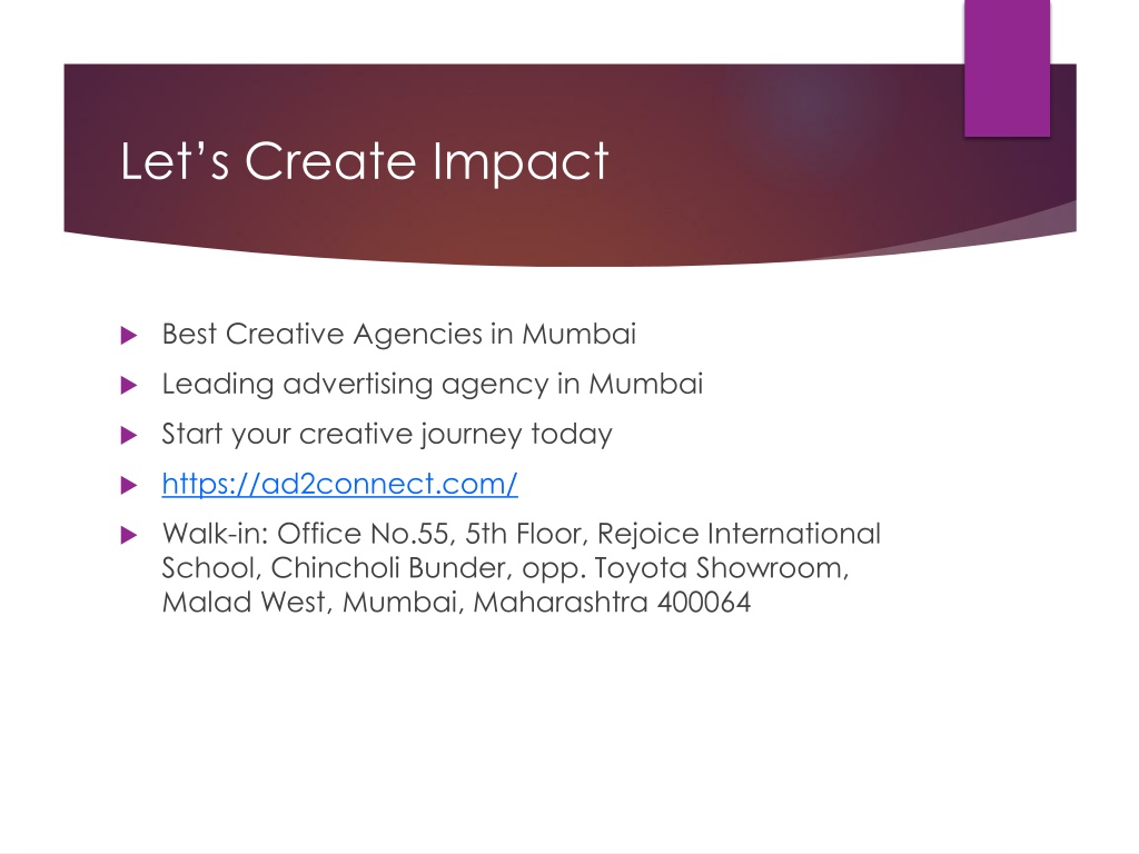 Let’s Create Impact Best Creative Agencies in Mumbai Leading advertising agency in Mumbai Start your creative journey today https://ad2connect.com/ Walk-in: Office No.55, 5th Floor, Rejoice International School, Chincholi Bunder, opp. Toyota Showroom, Malad West, Mumbai, Maharashtra 400064