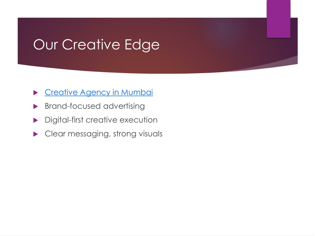 Our Creative Edge Creative Agency in Mumbai Brand-focused advertising Digital-first creative execution Clear messaging, strong visuals