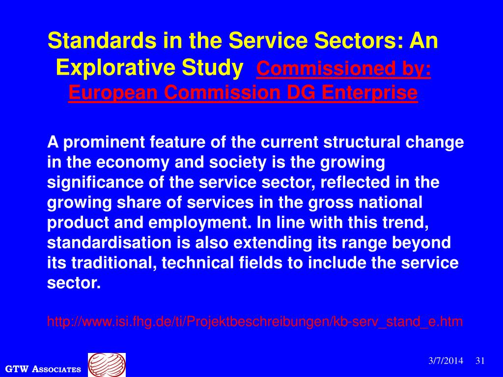 Standards in the Service Sectors: An Explorative Study Commissioned by: European Commission DG Enterprise A prominent feature of the current structural change in the economy and society is the growing significance of the service sector, reflected in the growing share of services in the gross national product and employment. In line with this trend, standardisation is also extending its range beyond its traditional, technical fields to include the service sector. http://www.isi.fhg.de/ti/Projektbeschreibungen/kb-serv_stand_e.htm