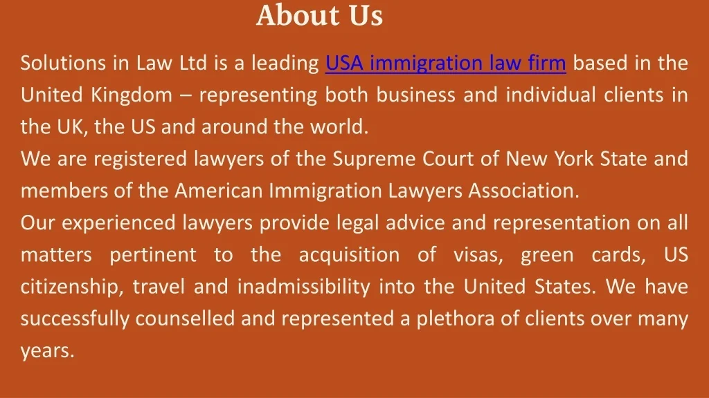 About Us Solutions in Law Ltd is a leading USA immigration law firm based in the United Kingdom – representing both business and individual clients in the UK, the US and around the world. We are registered lawyers of the Supreme Court of New York State and members of the American Immigration Lawyers Association. Our experienced lawyers provide legal advice and representation on all matters pertinent to the acquisition of visas, green cards, US citizenship, travel and inadmissibility into the United States. We have successfully counselled and represented a plethora of clients over many years.
