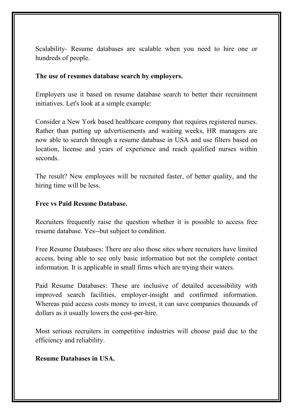 search of the employers, the hiring managers are able to directly relate with the potential candidates with regards to job requirements. Rather than wait and hope that resumes will come in, recruiters are able to target talent and save time, which enhances quality of the hires. The Reasons Why Resume Databases Are Necessary In The USA. The U.S. has a competitive job market, so the companies require solutions to hiring that are smarter. In USA, a resume database provides the quickest access to millions of skilled professionals in industries such as IT, finance, healthcare and engineering. As an illustration, recruiters do not have to search hundreds of irrelevant applications on job boards, but they are able to filter the applications and contact the ones with the appropriate skills and experience. A resume database of USA also guarantees that the employers get access to local and national talent pools promptly. The Advantages of Resume Database to Recruiters. It is not only a tool to recruiters but it is also an asset to a resume database. Here's why: Speedy Processing - Recruiters are able to quickly contact pre-screen candidates. Narrow-Down Search - Advanced filters allow narrowing down searches by skills, education, location or experience. Tapping Passive Talent- Not every candidate will apply to job. A lot of resumes in databases are those of professionals who are not active job seekers but are interested in taking opportunities. Lowered Costs - Rather than using a lot of money to advertise, the firms can afford to use one resume database search to access numerous employers to fill numerous positions.