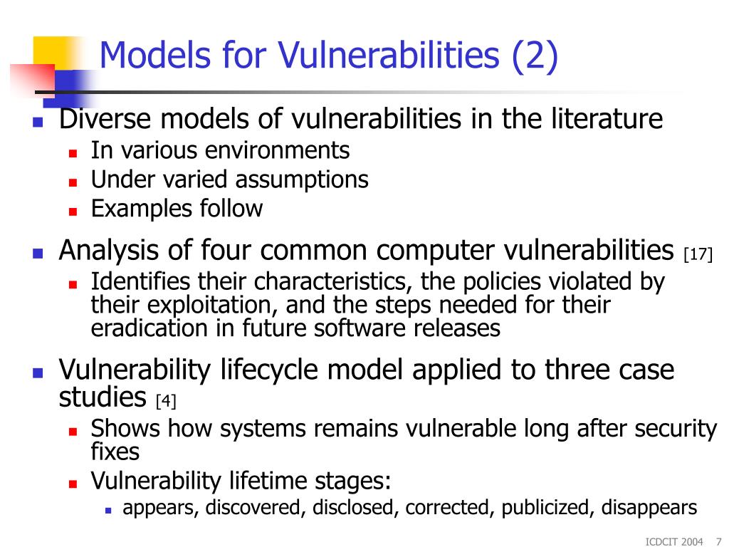 Models for Vulnerabilities (2) • Diverse models of vulnerabilities in the literature • In various environments • Under varied assumptions • Examples follow • Analysis of four common computer vulnerabilities [17] • Identifies their characteristics, the policies violated by their exploitation, and the steps needed for their eradication in future software releases • Vulnerability lifecycle model applied to three case studies [4] • Shows how systems remains vulnerable long after security fixes • Vulnerability lifetime stages: • appears, discovered, disclosed, corrected, publicized, disappears