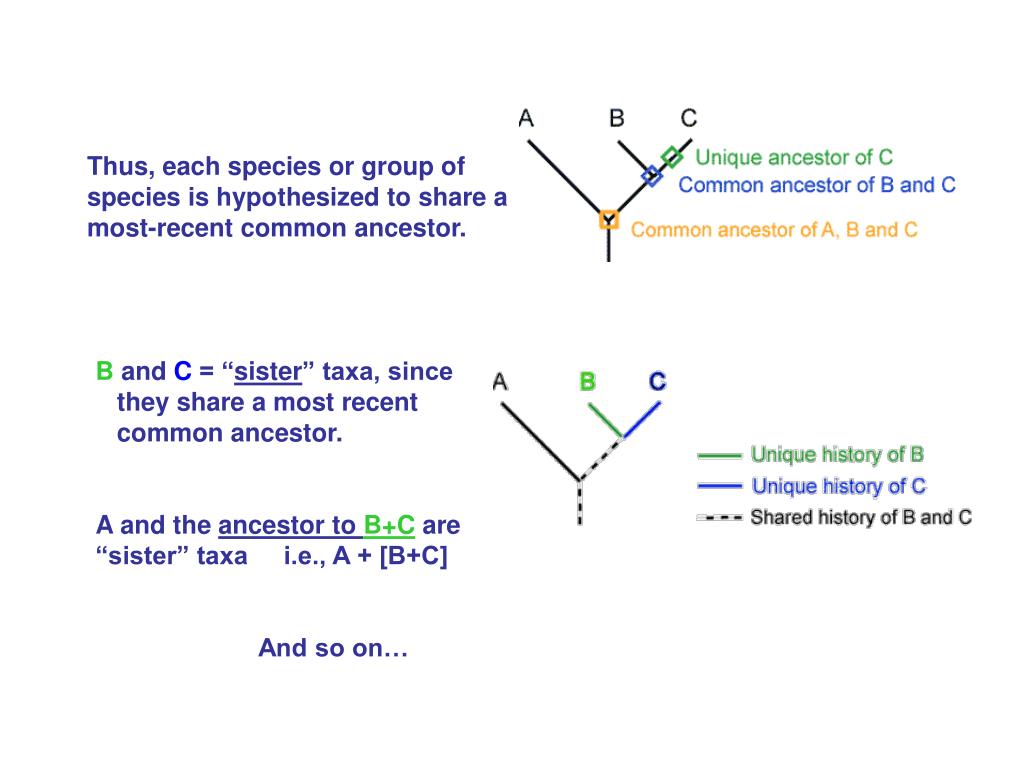 Thus, each species or group of species is hypothesized to share a most-recent common ancestor. B and C = “sister” taxa, since they share a most recent common ancestor. A and the ancestor to B+C are “sister” taxa i.e., A + [B+C] And so on…