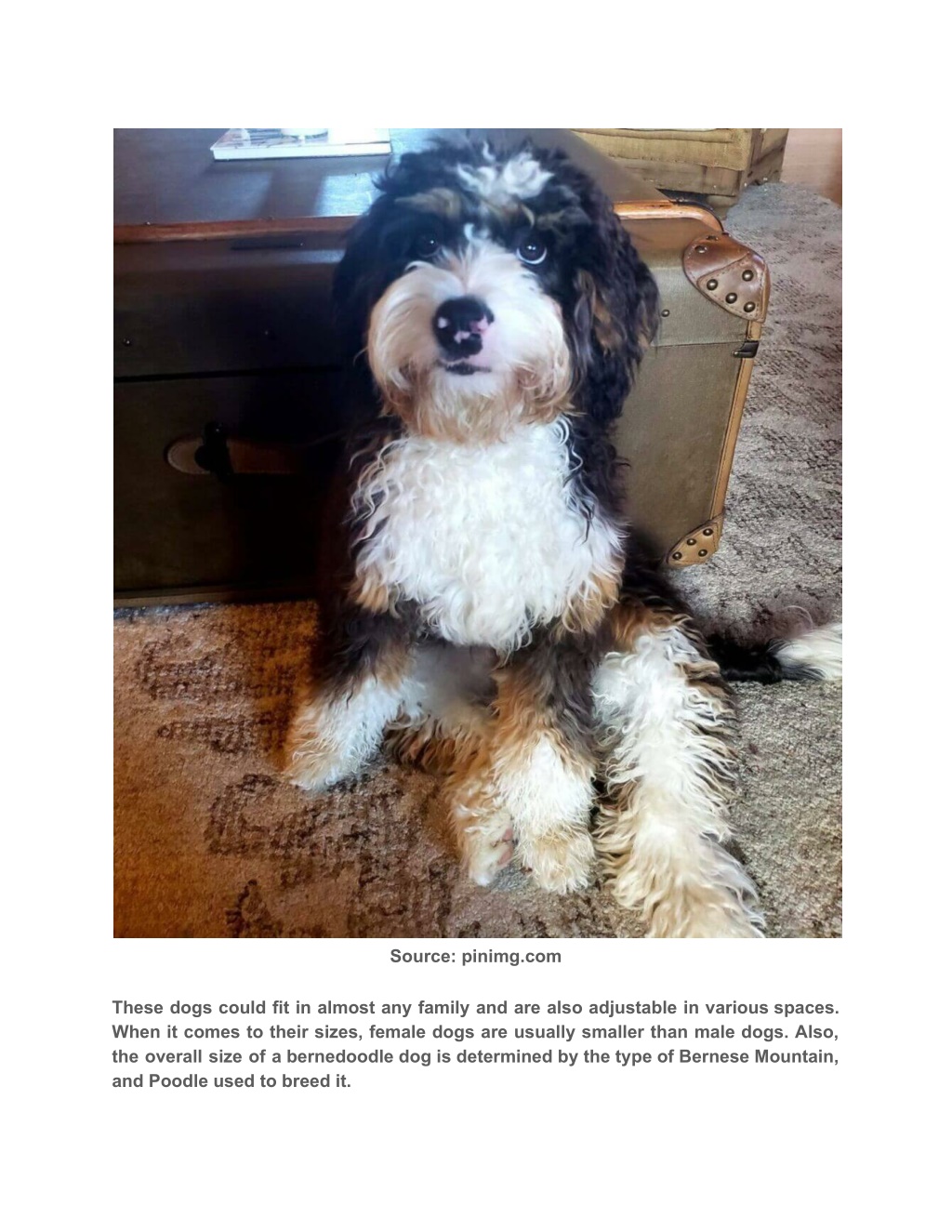 Source: pinimg.com These dogs could fit in almost any family and are also adjustable in various spaces. When it comes to their sizes, female dogs are usually smaller than male dogs. Also, the overall size of a bernedoodle dog is determined by the type of Bernese Mountain, and Poodle used to breed it.