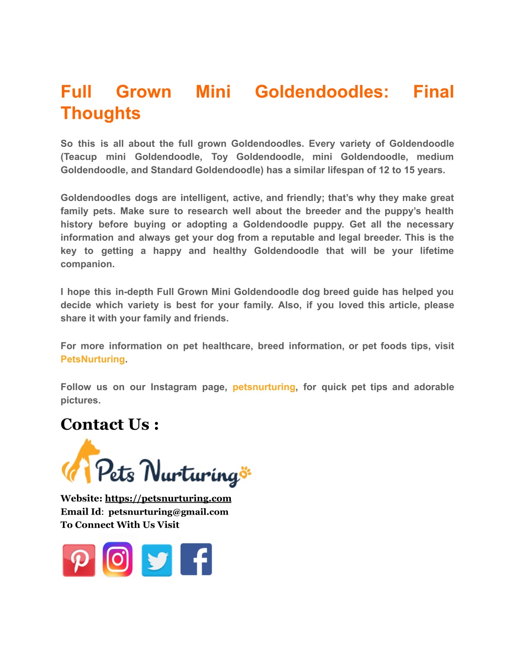 Full Thoughts Grown Mini Goldendoodles: Final So this is all about the full grown Goldendoodles. Every variety of Goldendoodle (Teacup mini Goldendoodle, Toy Goldendoodle, mini Goldendoodle, medium Goldendoodle, and Standard Goldendoodle) has a similar lifespan of 12 to 15 years. Goldendoodles dogs are intelligent, active, and friendly; that’s why they make great family pets. Make sure to research well about the breeder and the puppy’s health history before buying or adopting a Goldendoodle puppy. Get all the necessary information and always get your dog from a reputable and legal breeder. This is the key to getting a happy and healthy Goldendoodle that will be your lifetime companion. I hope this in-depth Full Grown Mini Goldendoodle dog breed guide has helped you decide which variety is best for your family. Also, if you loved this article, please share it with your family and friends. For more information on pet healthcare, breed information, or pet foods tips, visit PetsNurturing. Follow us on our Instagram page, petsnurturing, for quick pet tips and adorable pictures. Contact Us : Website: https://petsnurturing.com Email Id: petsnurturing@gmail.com To Connect With Us Visit