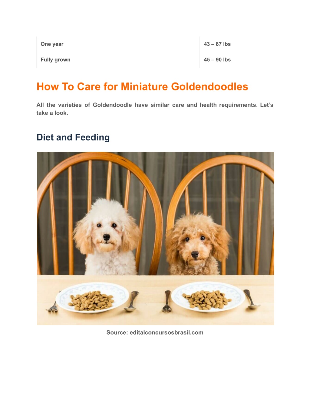 One year 43 – 87 lbs Fully grown 45 – 90 lbs How To Care for Miniature Goldendoodles All the varieties of Goldendoodle have similar care and health requirements. Let’s take a look. Diet and Feeding Source: editalconcursosbrasil.com