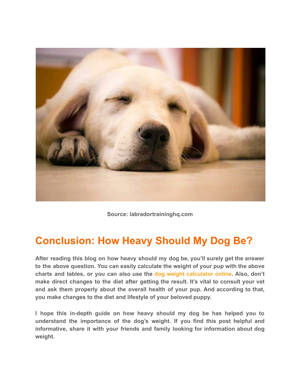 Source: labradortraininghq.com Conclusion: How Heavy Should My Dog Be? After reading this blog on how heavy should my dog be, you’ll surely get the answer to the above question. You can easily calculate the weight of your pup with the above charts and tables, or you can also use the dog weight calculator online. Also, don’t make direct changes to the diet after getting the result. It’s vital to consult your vet and ask them properly about the overall health of your pup. And according to that, you make changes to the diet and lifestyle of your beloved puppy. I hope this in-depth guide on how heavy should my dog be has helped you to understand the importance of the dog’s weight. If you find this post helpful and informative, share it with your friends and family looking for information about dog weight.