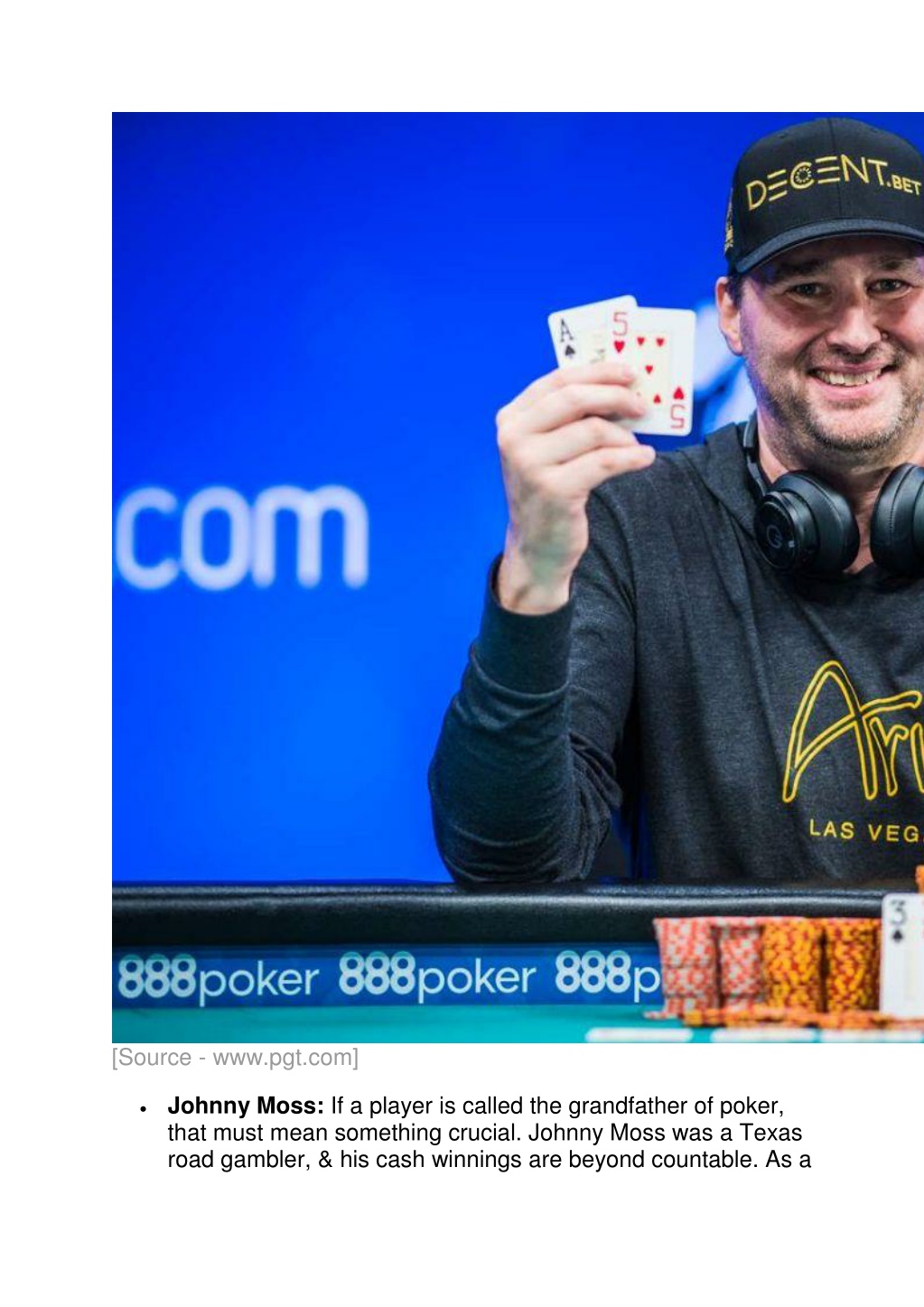 [Source - www.pgt.com] Johnny Moss: If a player is called the grandfather of poker, that must mean something crucial. Johnny Moss was a Texas road gambler, & his cash winnings are beyond countable. As a