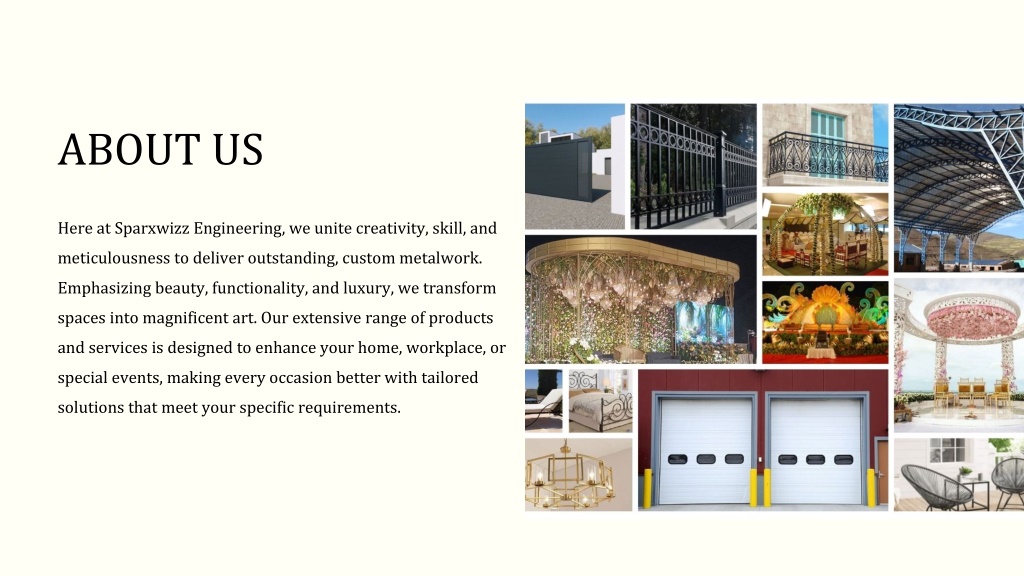 ABOUT US Here at Sparxwizz Engineering, we unite creativity, skill, and meticulousness to deliver outstanding, custom metalwork. Emphasizing beauty, functionality, and luxury, we transform spaces into magnificent art. Our extensive range of products and services is designed to enhance your home, workplace, or special events, making every occasion better with tailored solutions that meet your specific requirements.