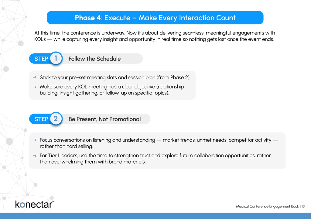 Phase 4: Execute – Make Every Interaction Count At this time, the conference is underway. Now it’s about delivering seamless, meaningful engagements with KOLs — while capturing every insight and opportunity in real time so nothing gets lost once the event ends. 1 STEP Follow the Schedule Stick to your pre-set meeting slots and session plan (from Phase 2). Make sure every KOL meeting has a clear objective (relationship building, insight gathering, or follow-up on specific topics). 2 STEP Be Present, Not Promotional Focus conversations on listening and understanding — market trends, unmet needs, competitor activity — rather than hard selling. For Tier 1 leaders, use the time to strengthen trust and explore future collaboration opportunities, rather than overwhelming them with brand materials. medical conference engagement Book | 13