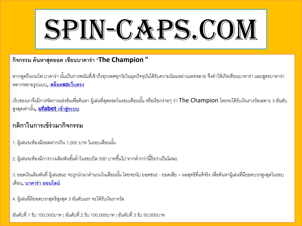 Spin-caps.com กิจกรรม ค้นหาสุดยอด เซียนบาคาร่า "The Champion " หากพูดถึงเกมไพ่ บาคาร่า นั้นเป็นการพนันที่เข้าถึงทุกเพศทุกวัยในยุคปัจจุบันได้รับความนิยมอย่างแพร่หลาย จึงทำให้เกิดเซียนบาคาร่า และสูตรบาคาร่าหลากหลายรูปแบบ, สล็อตxoเว็บตรง เว็บของเราจึงมีการจัดการแข่งขันเพื่อค้นหา ผู้เล่นที่สุดยอดในรอบเดือนนั้น หรือเรียกง่ายๆ ว่า The Champion โดยจะได้รับเงินรางวัลเฉพาะ 3 อันดับสูงสุดเท่านั้น, ufabetเข้าสู่ระบบ กติกาในการเข้ร่วมากิจกรรม 1. ผู้เล่นจะต้องมียอดฝากเกิน 1,000 บาท ในรอบเดือนนั้น 2. ผู้เล่นจะต้องมีการวางเดิมพันขั้นต่ำในรอบบิล 500 บาทขึ้นไป หากต่ำกว่านี้ถือว่าเป็นโมฆะ 3. ยอดเงินเดิมพันที่ ผู้เล่นชนะ จะถูกนำมาคำนวนในเดือนนั้น โดยจะนับ ยอดชนะ - ยอดเสีย = ผลสุทธิที่แท้จริง เพื่อค้นหาผู้เล่นที่มียอดบวกสูงสุดในรอบเดือน, บาคาร่า ออนไลน์ 4. ผู้เล่นที่มียอดบวกสุทธิสูงสุด 3 อันดับแรก จะได้รับเงินรางวัล อันดับที่ 1 รับ 150,000บาท | อันดับที่ 2 รับ 100,000บาท | อันดับที่ 3 รับ 50,000บาท