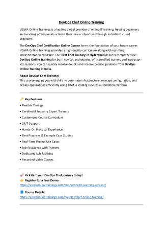 DevOps Chef Online Training VISWA Online Trainings is a leading global provider of online IT training, helping beginners and working professionals achieve their career objectives through industry-focused programs. The DevOps Chef Certification Online Course forms the foundation of your future career. VISWA Online Trainings provides a high-quality curriculum along with real-time implementation exposure. Our Best Chef Training in Hyderabad delivers comprehensive DevOps Online Training for both novices and experts. With certified trainers and instructor- led sessions, you can quickly resolve doubts and receive precise guidance from DevOps Online Training in India. About DevOps Chef Training: This course equips you with skills to automate infrastructure, manage configuration, and deploy applications efficiently using Chef, a leading DevOps automation platform. Key Features • Flexible Timings • Certified & Industry Expert Trainers • Customized Course Curriculum • 24/7 Support • Hands-On Practical Experience • Best Practices & Example Case Studies • Real-Time Project Use Cases • Job Assistance with Trainers • Dedicated Lab Facilities • Recorded Video Classes Kickstart your DevOps Chef journey today! Register for a Free Demo: https://viswaonlinetrainings.com/connect-with-learning-advisor/ Course Details: https://viswaonlinetrainings.com/courses/chef-online-training/