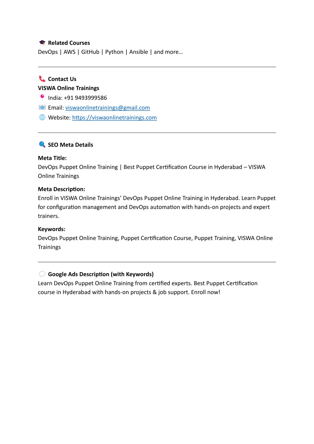Related Courses DevOps | AWS | GitHub | Python | Ansible | and more… Contact Us VISWA Online Trainings India: +91 9493999586 Email: viswaonlinetrainings@gmail.com Website: https://viswaonlinetrainings.com SEO Meta Details Meta Title: DevOps Puppet Online Training | Best Puppet Certification Course in Hyderabad – VISWA Online Trainings Meta Description: Enroll in VISWA Online Trainings’ DevOps Puppet Online Training in Hyderabad. Learn Puppet for configuration management and DevOps automation with hands-on projects and expert trainers. Keywords: DevOps Puppet Online Training, Puppet Certification Course, Puppet Training, VISWA Online Trainings Google Ads Description (with Keywords) Learn DevOps Puppet Online Training from certified experts. Best Puppet Certification course in Hyderabad with hands-on projects & job support. Enroll now!